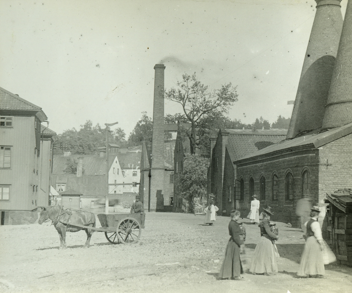 Fabriksgården. Gula byggningen skymtar till vänster. Stenhusen i bakgrunden.