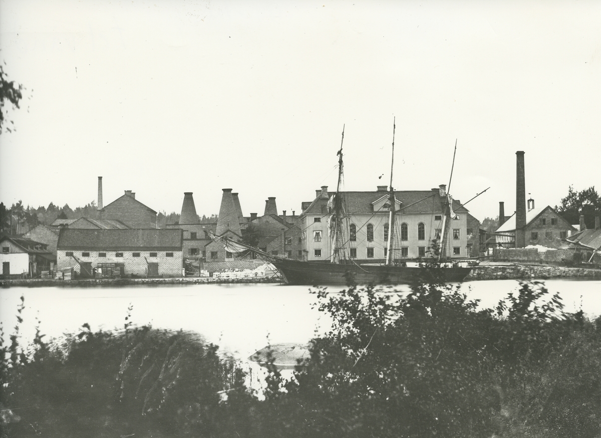 Vy mot hamnen med Brännhuskomplexet i mitten och Gula byggningen bakom segelfartyget.