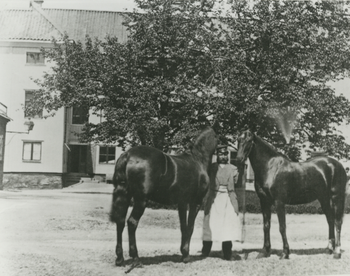Kusken Andersson med hästarna Nord och Södern framför Gamla kontoret (Gula byggningen).