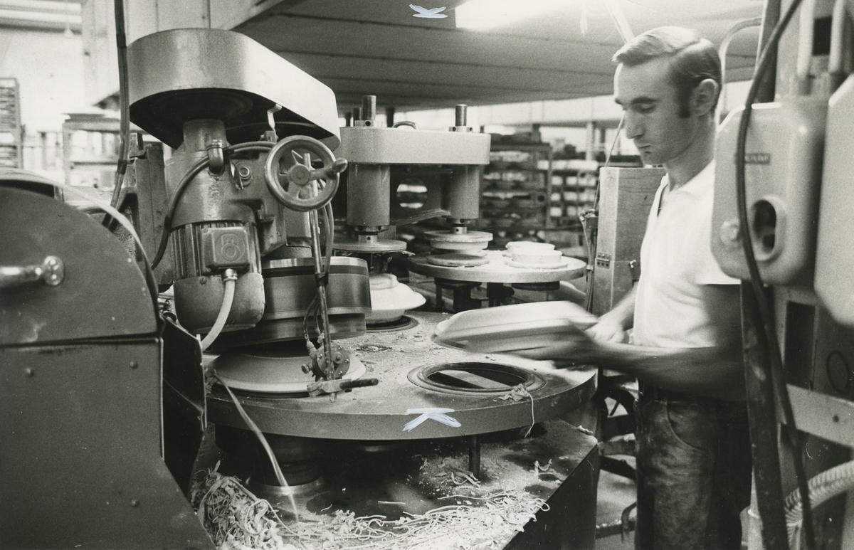 Interiör, Hushållsporslinsfabriken. Automatisk tallriksformning i rollermaskin infördes i mitten på 1960-talet.<br>