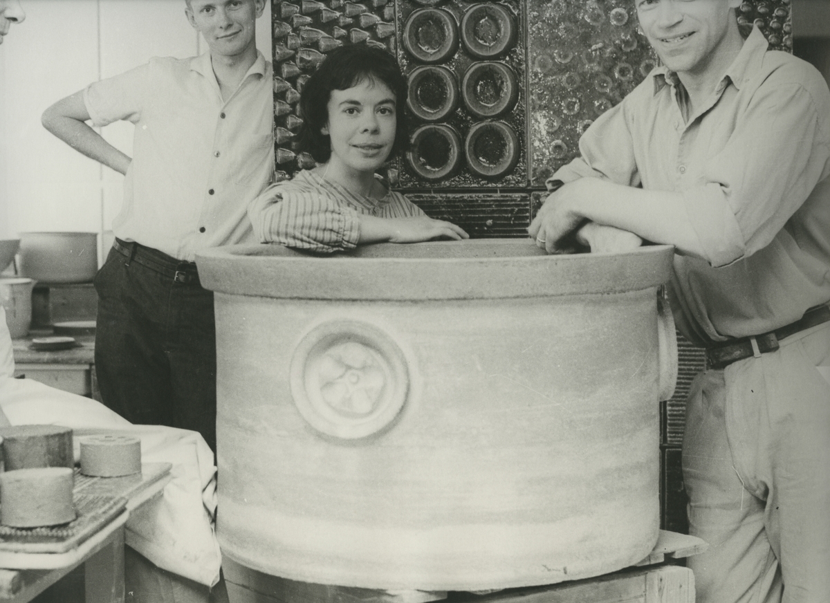 Interiörbild. Gustavsbergs Fabriker. Stort lerkärl med formgivare Karin Björquist i mitten.