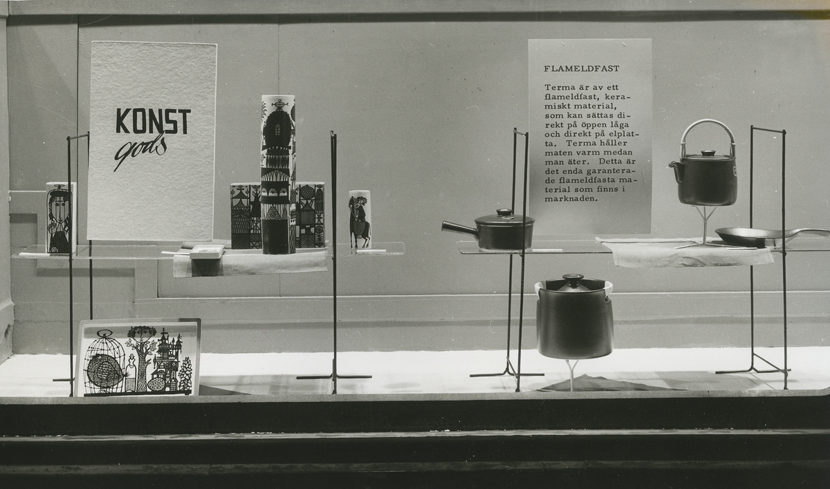 Skyltning eller monter med konstgods.och eldfast gods,Terma, i design av Stig Lindberg. Okänd lokal.