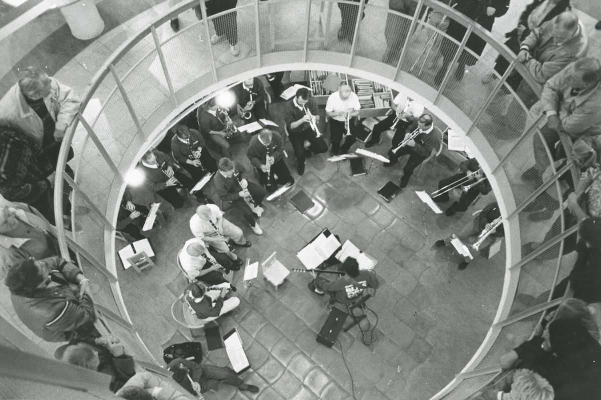 Interiörbild. Runda huset, kulturhus och bibliotek. Musikevenemang.