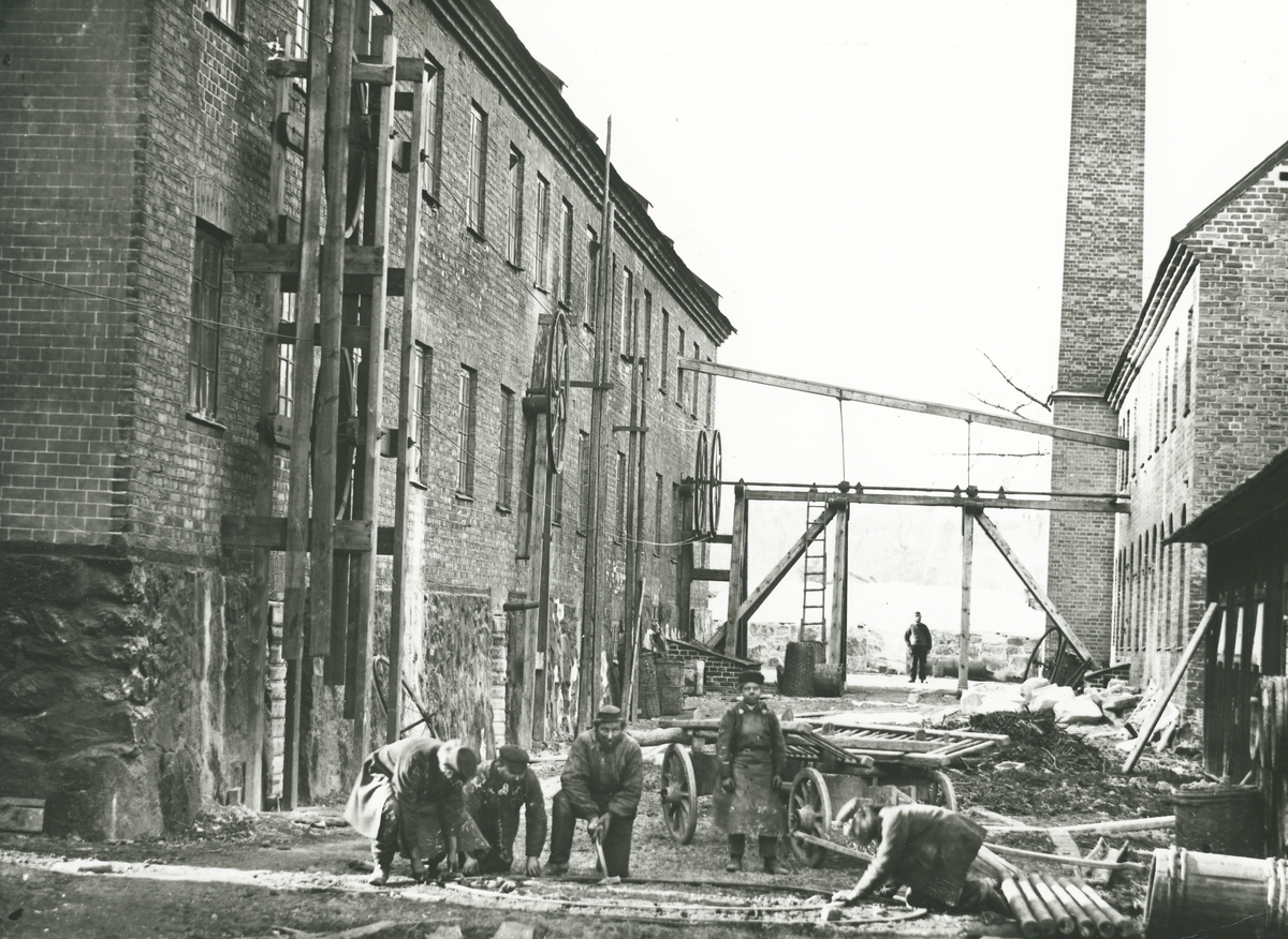 Exteriör. Vy över Gustavsbergs fabriksområde. Slamhusgatan sedd från söder. Gamla verkstaden från 1852-53 t.v. Slamhuset. Bilden visar även hjul och transmissionsaxlar.