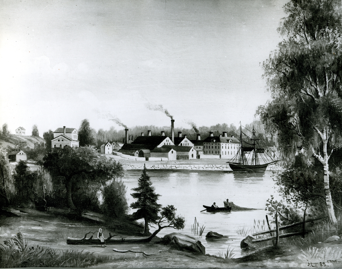 Målning av fabriken från 1888 efter ett träsnitt 1869 av Magnus Isaeus. Vy mot fabriken från Farstavikens södra strand (Arvidsson, 2007:27).