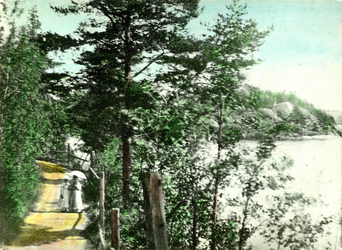 Damer på promenad. Värmdövägens tvära kurva runt berget mellan Loviseberg och Eriksberg, med Skräddarviken och Kalsongberget t.h..