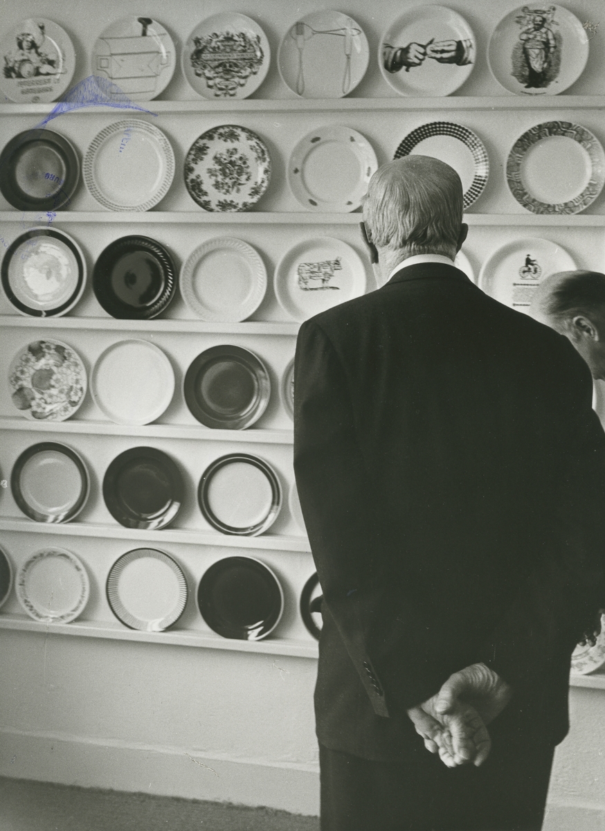 Kungligt besök på Gustavsbergs porslinsfabrik, sannolikt Porslinsmuseet i Gula Husets Gamla kontorets kyrksal.