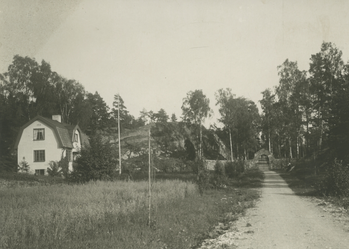 Porten till nya kyrkogården (den som nu är i funktion). T.v. utanför kyrkogårdsmuren ligger kyrkogårdsvaktmästarbostaden, daterad 1910 ritad av Ferdinand Boberg.