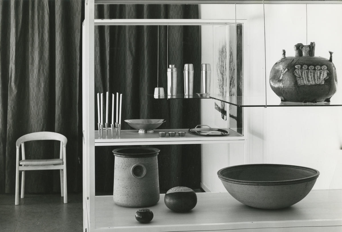 Interiör.Utställning för Svensk Form i Köpenhamn, bl a med stengods av de keramiska formgivarna Karin Björquist och Lisa Larsson. Förutom konstgodset visades också sanitetsporslin, plastvaror och hushållsporslin från Gustavsbergs Fabriker 1961,