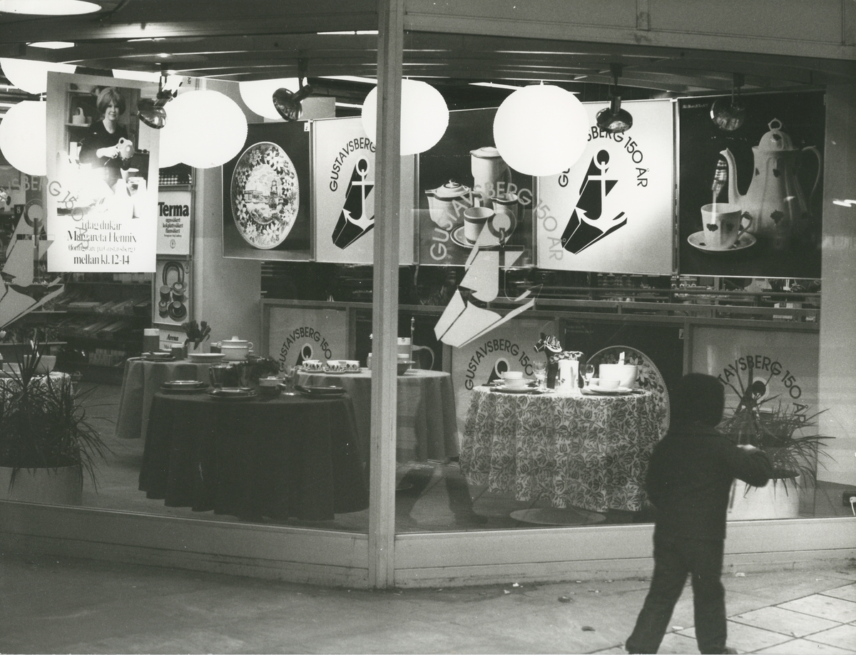 Exteriörbild. Gustavsberg 150 år. Utställning på PUB-varuhuset i Stockholm City. Skyltning med hushållsporslin m m.