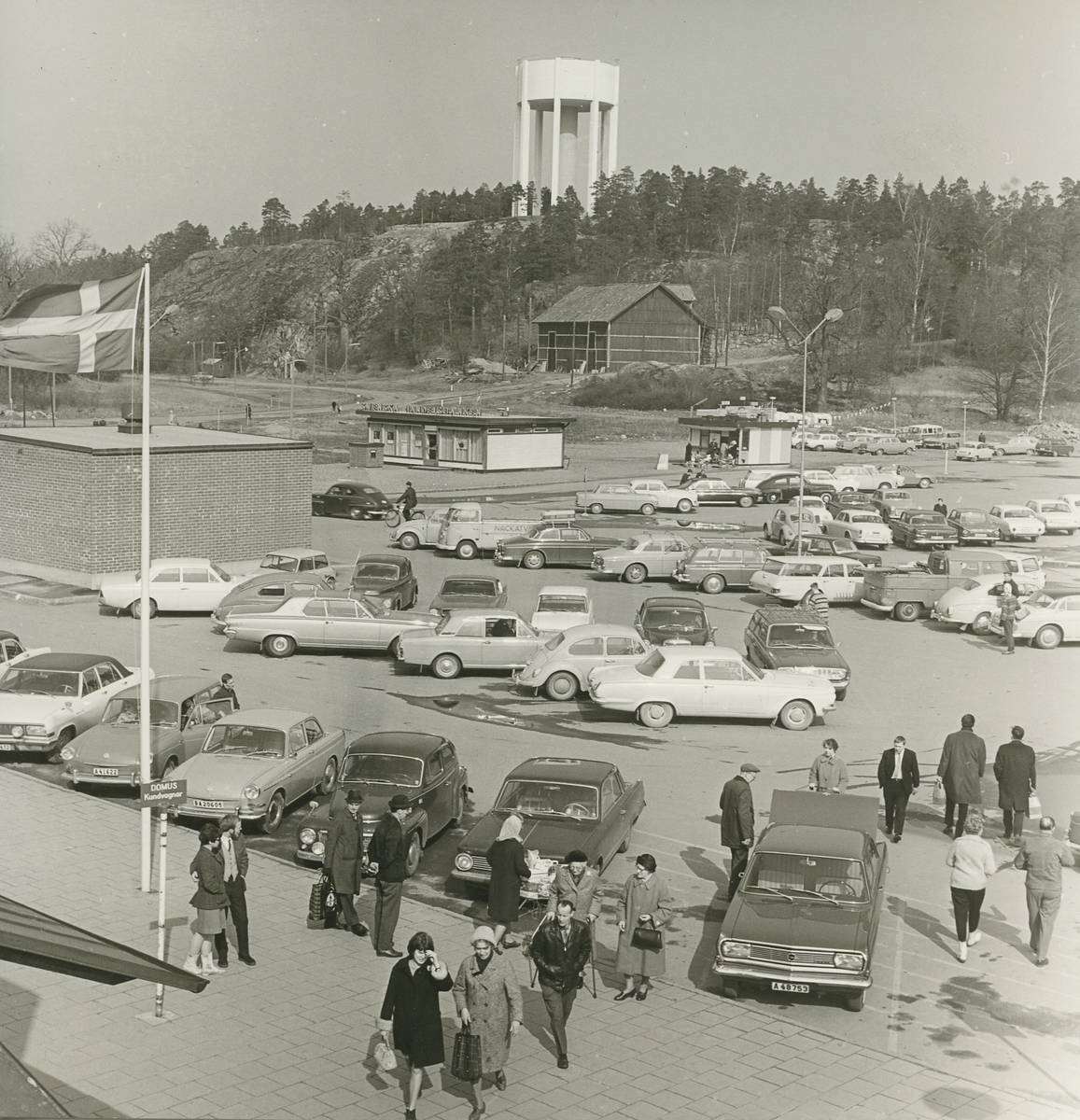 Exteriörbild. Gustavsbergs centrum. Domus-parkeringen med Svenska Handelsbanken och grillkiosk. Vattentornet i bakgrunden och nedanför Rutens lada som brann ned på 1990-talet.