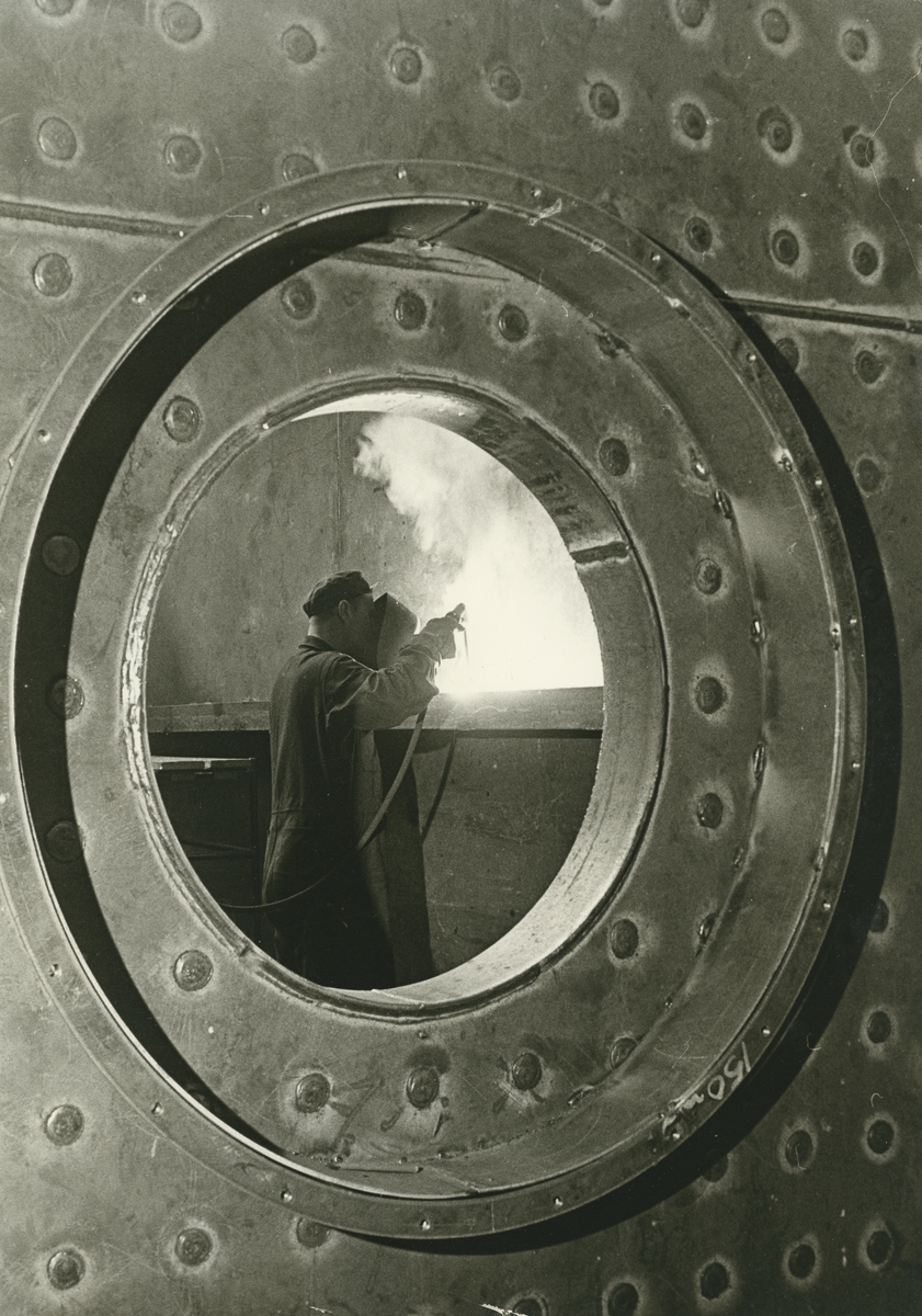 Interiör, detaljbild. Badkarsfabriken. Svetsning av högeffektpanna.