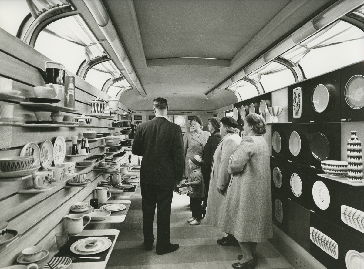 Interiör. Gustavsbergsbussen med visningsansvarig och besökare som tar del av utställningen.