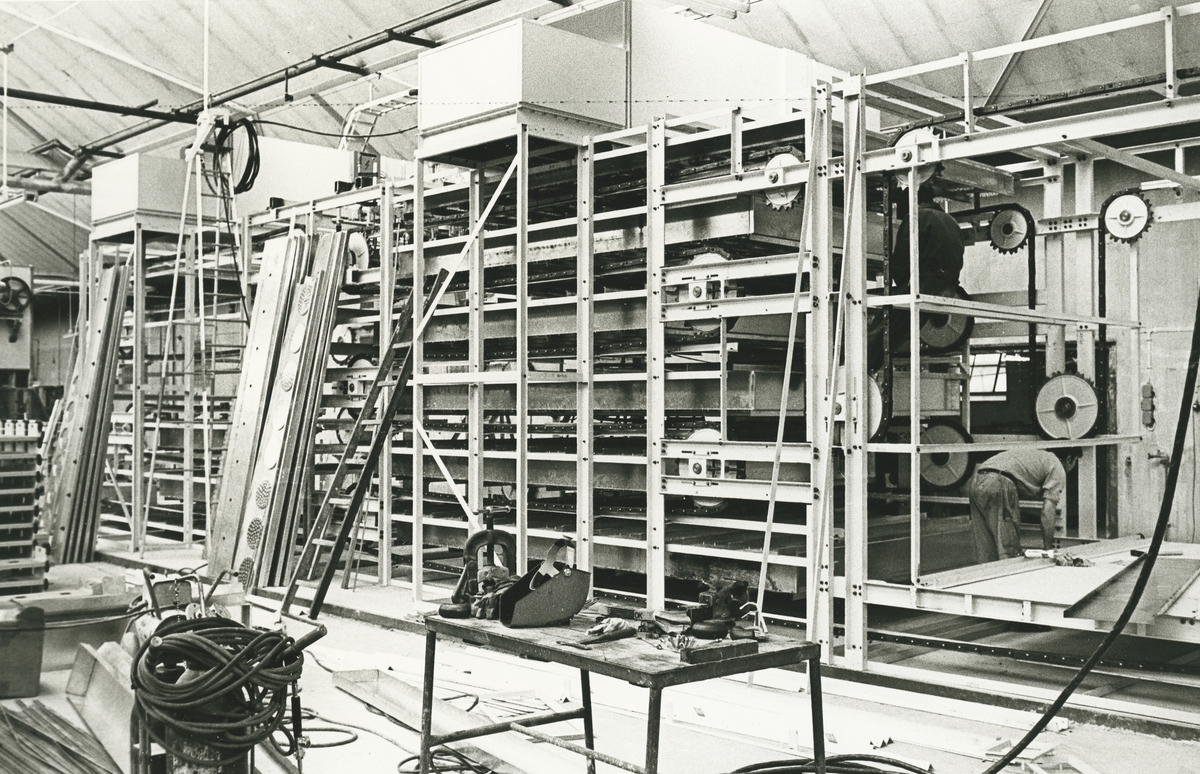 Interiör. Gustavsbergs fabiker. Pågående installation av automatisk rollermaskin med torkskåp för flatgods på hushållsporslinsfabriken.