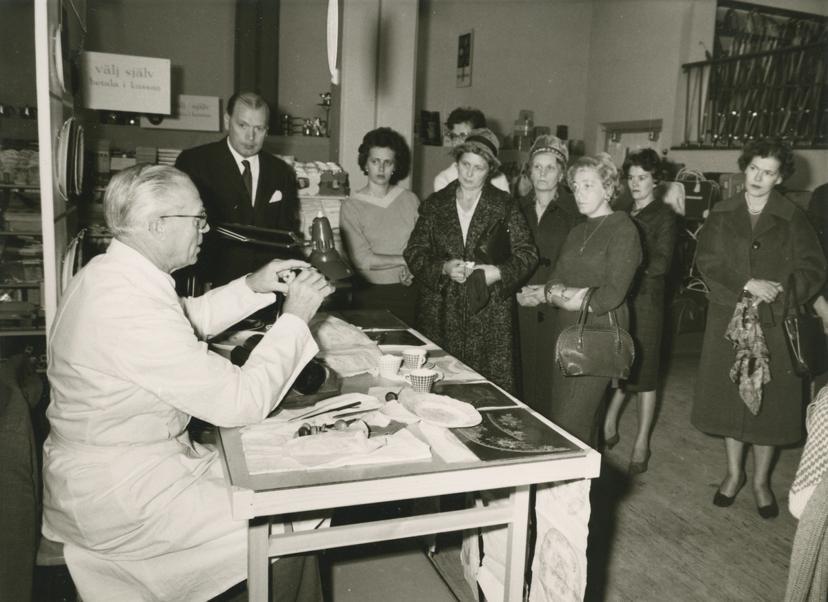 Interiörbild. Svenskt i Topp. Gustavsbergs Fabriker visar tillvägagångssättet vid porslinsdekor. Turné ute i landet, sannolikt i samarbete med kooperationen i Sundsvall.