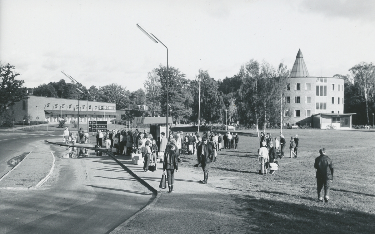 Exteriörbild. Kommunalhuset, Runda huset. I förgrunden busshållplats och i bakgrunden Domus.