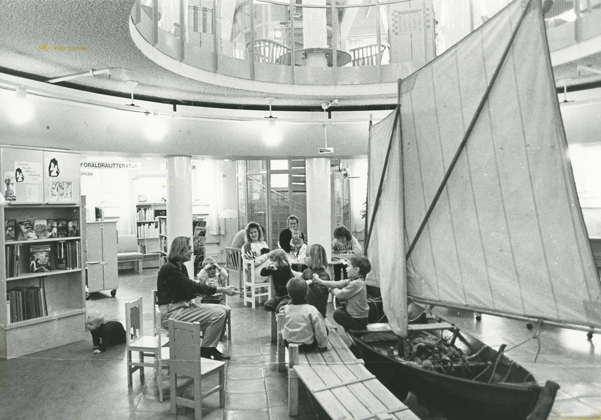 Interiörbild. Runda huset, biblioteket. Singösnipan Elvira, fantasins seglande båt..