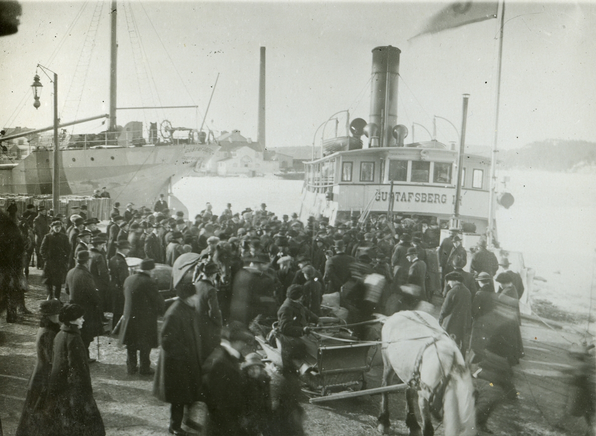 Folksamling på ångbåtskajen med Gustafsberg III i bakgrunden.