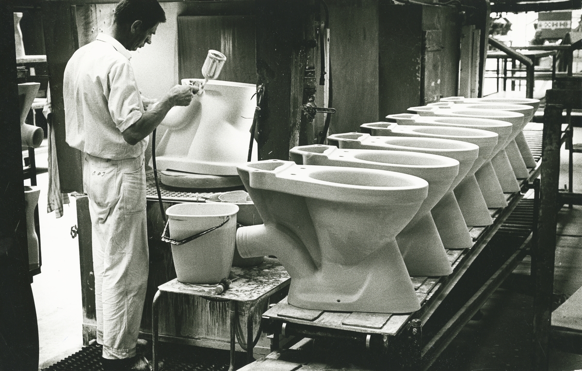 Interiör, Sanitetsporslinsfabriken. Sprutglasering av wc-stolar.
