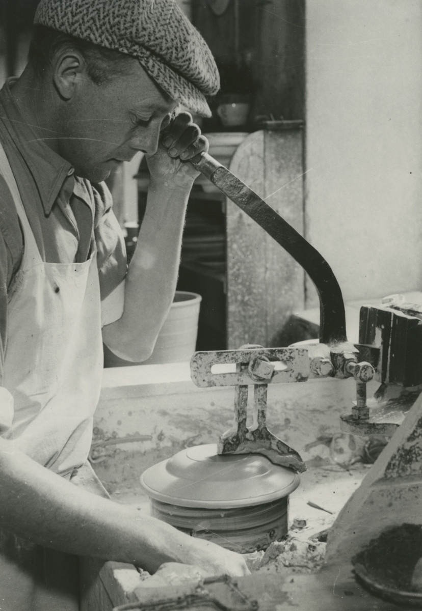 Maskinformning av tallrikar. Ett profilerat järnsteg pressas mot det mjuka massabladet på en roterande gipsform. Per dag tillverkades 800-1200 tallrikar beroende på storlek (Hald, 1991:40).
