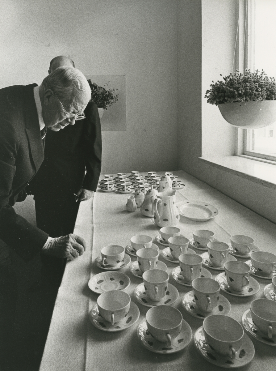 Interiör. Kung Gustav VI Adolf på besök i Gustavsbergs Fabriker. Förevisning av kaffeservisen Blå blom. Sannolikt på Keramiskt Centrum.