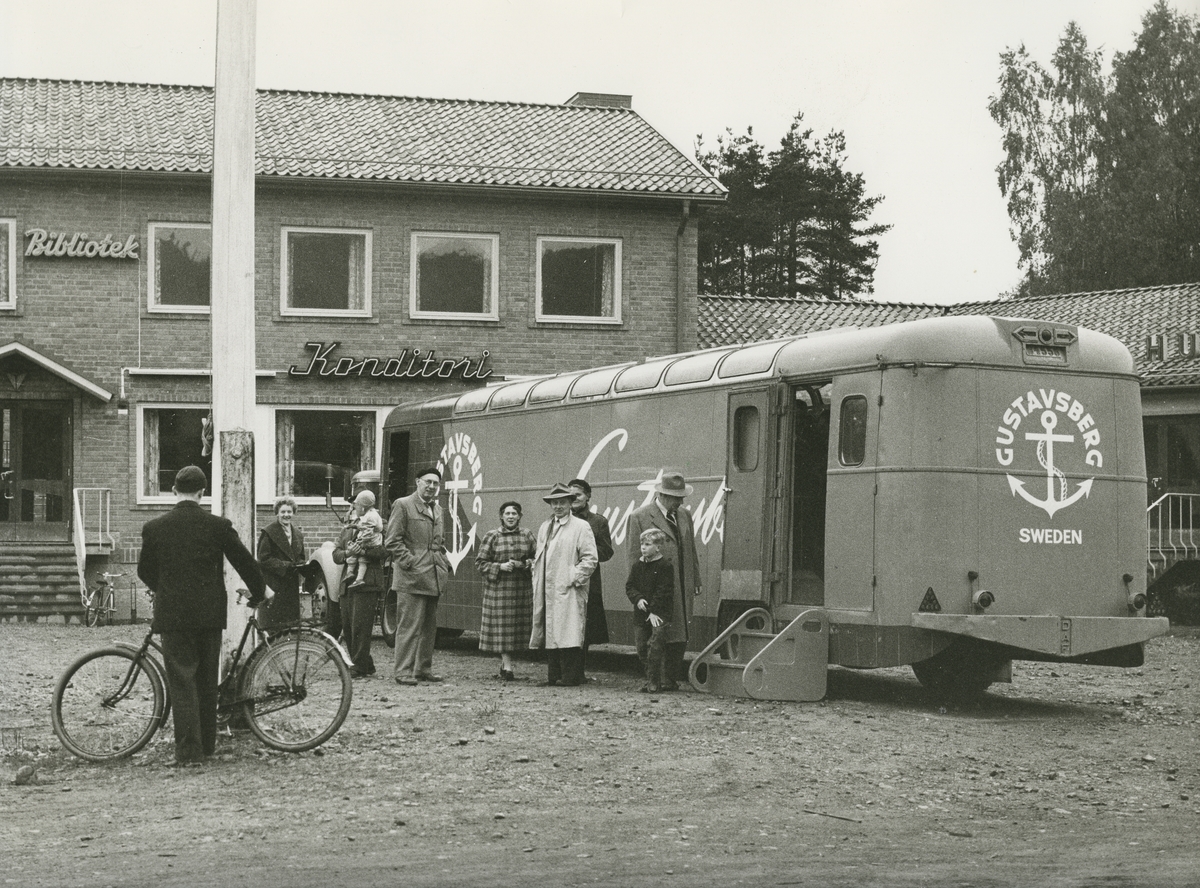 Exteriör. Gustavsbergsbussen parkerad utanför Folkets Hus och Forum. Sannolikt stad eller ort i Norrland.