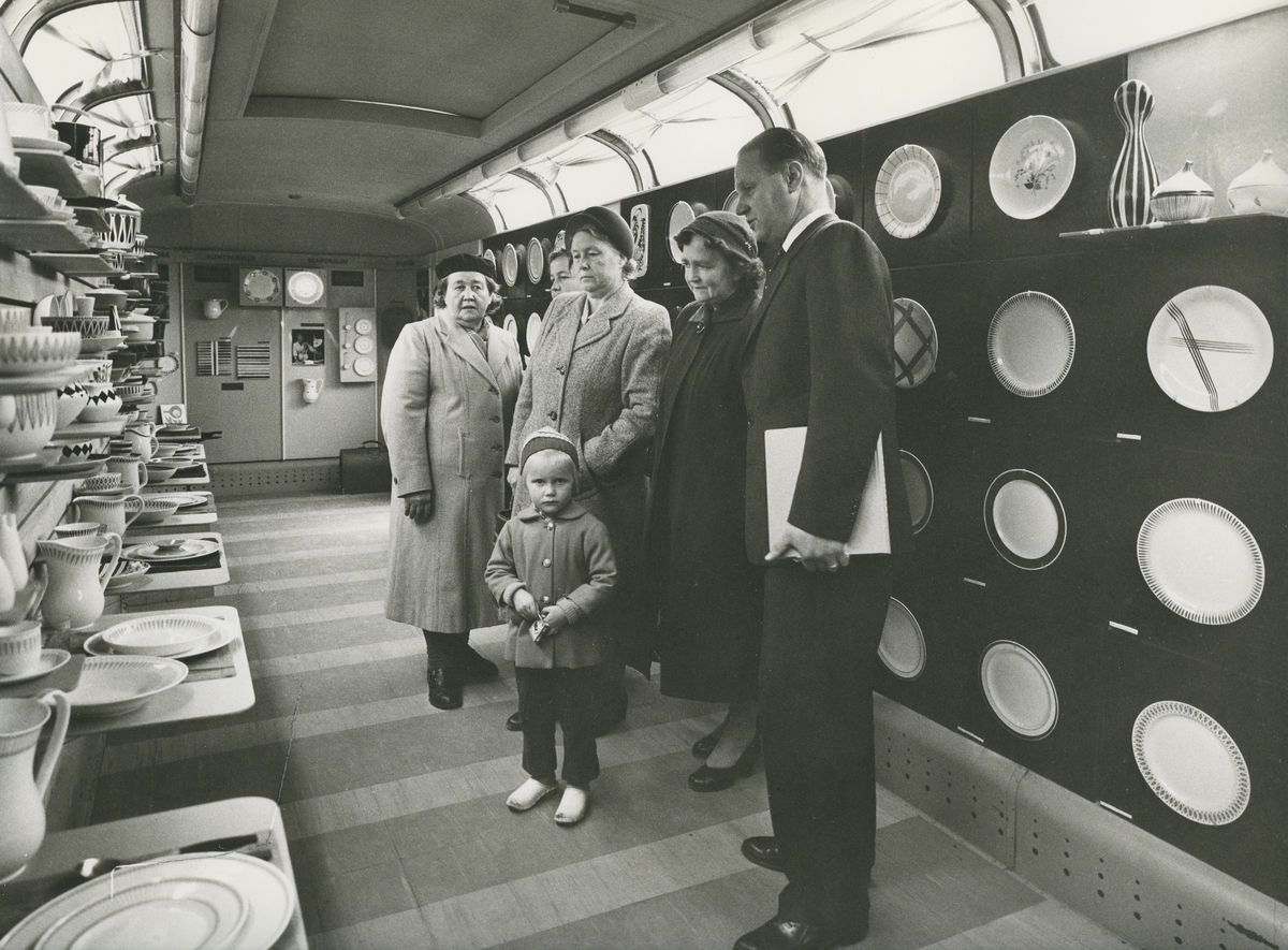 Interiör. Gustavsbergsbussen med visningsansvarig och besökare som tar del av utställningen.