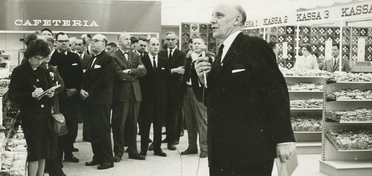 Interiör. Sannolikt invigning av Domusvaruhuset 1964 med föreningschefen Mattson i förgrunden.