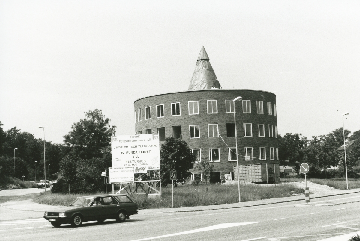 Exteriörbild. Kommunalhuset, Runda huset. Skylten upplyser om den förestående om- och tillbyggnaden av huset som ett led i dess omvandling till huvudbibliotek och kulturhus.