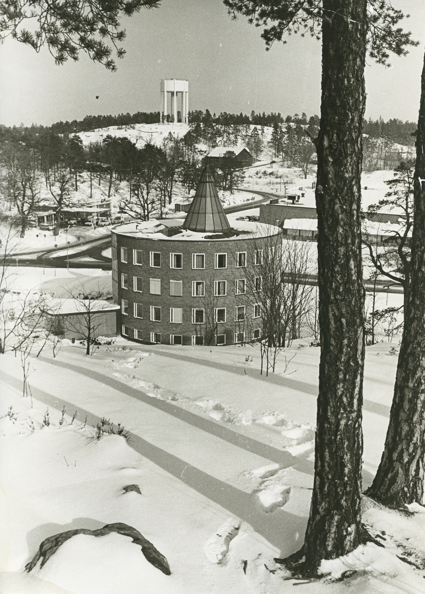 Exteriörbild. Kommunalhuset, Runda huset vintertid. I bakgrunden Domus, vattentornet och OK.