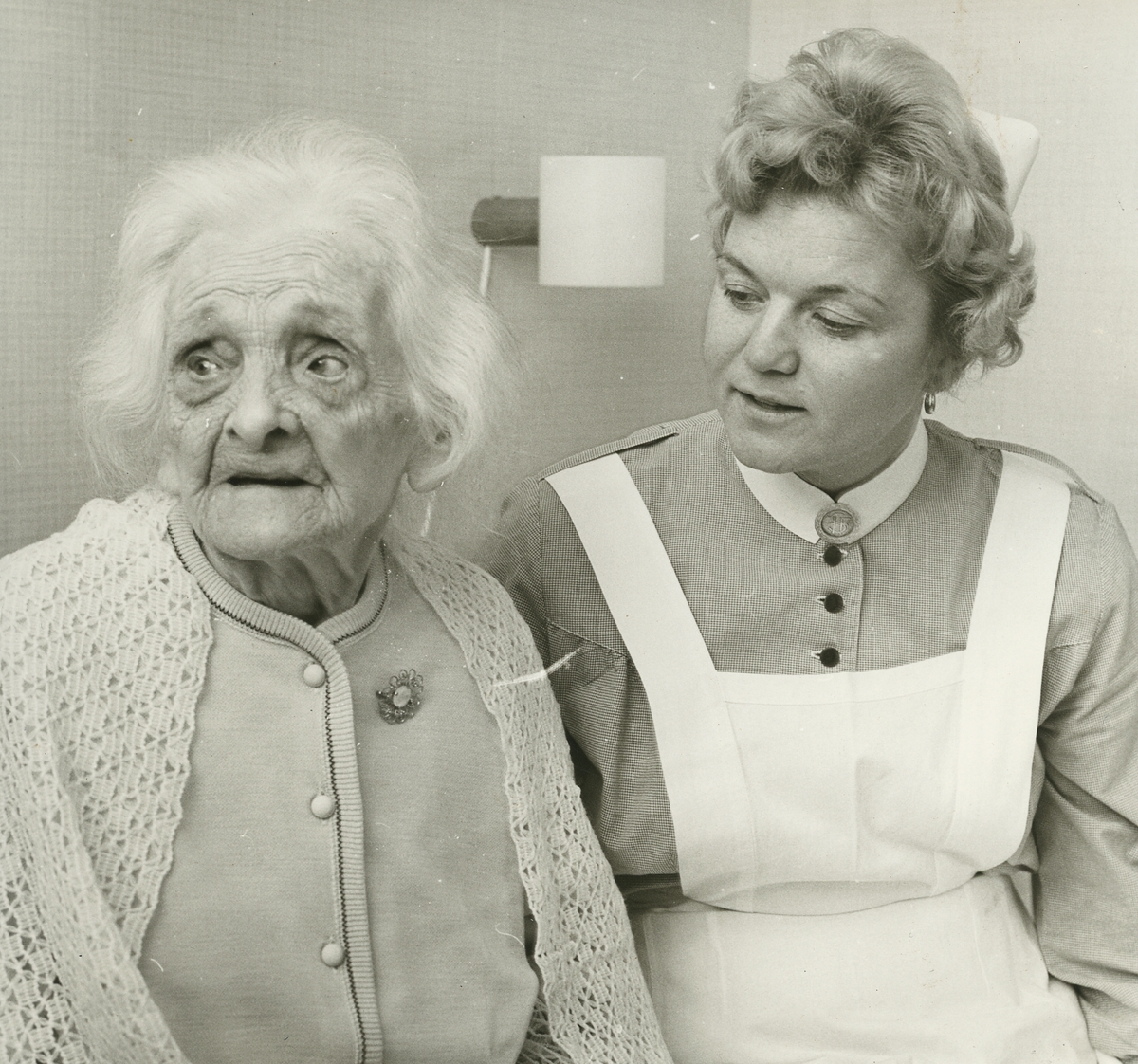 Gustavsgården. Anna Stein tillsammans med sköterska på sin hundraårsdag den 14 januari 1967.