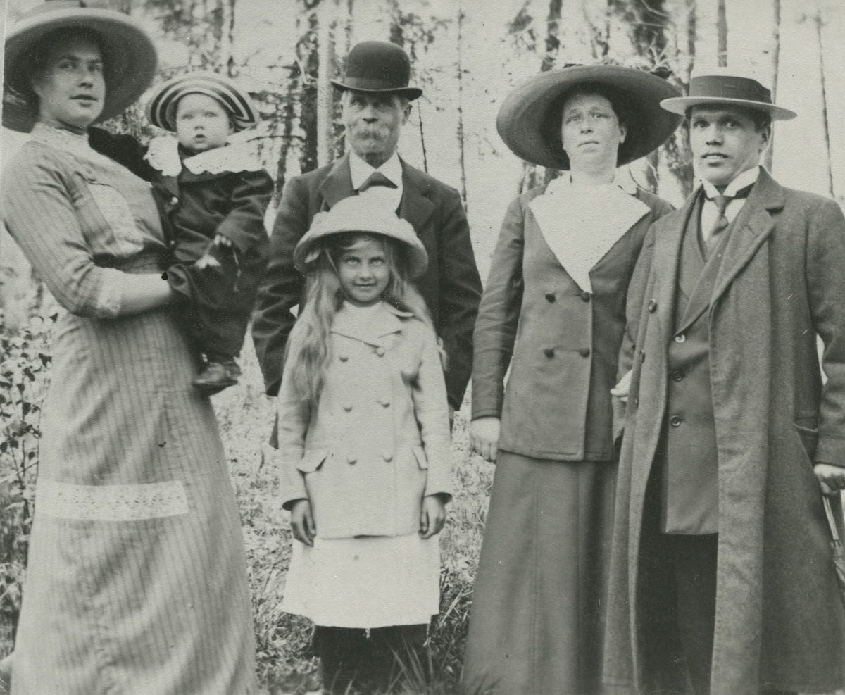 Titel: Familjen Olsson. Fr v Hulda Oldsson, gift med Adrian, med Ingrid på armen. Lars Olsson med Karin Backman framför. Gerda Olsson (född Larsson) och Aldor Olsson. Personer: Hulda Olsson, Ingrid Olsson, Lars Olsson, Karin Backman, Gerda Olsson, Aldor Olsson