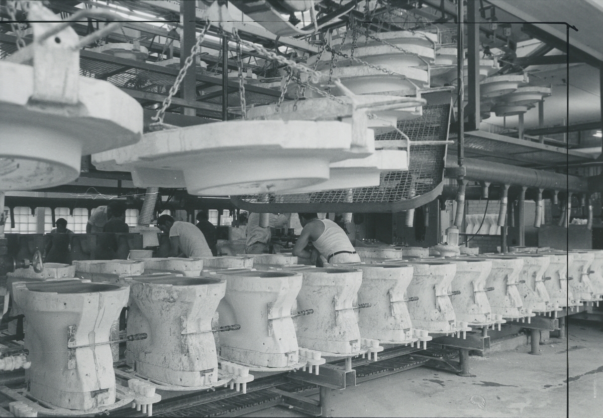 Interiör, Sanitetsporslinsfabriken. Gjutning av wc-stolar.<br>