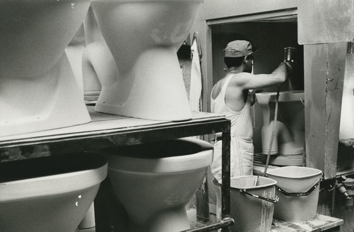 Interiör, Sanitetsporslinsfabriken. Sprutglasering i sprutskåp av wc-stolar.