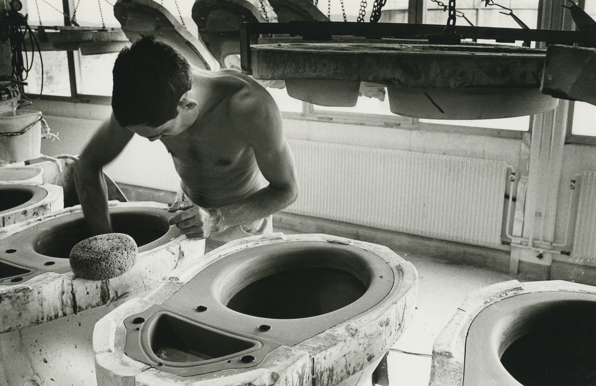 Titel: Interiör, Sanitetsporslinsfabriken. Bearbetning av gjuten wc-stol som fortfarande är kvar i gipsformen. Personer: okänd