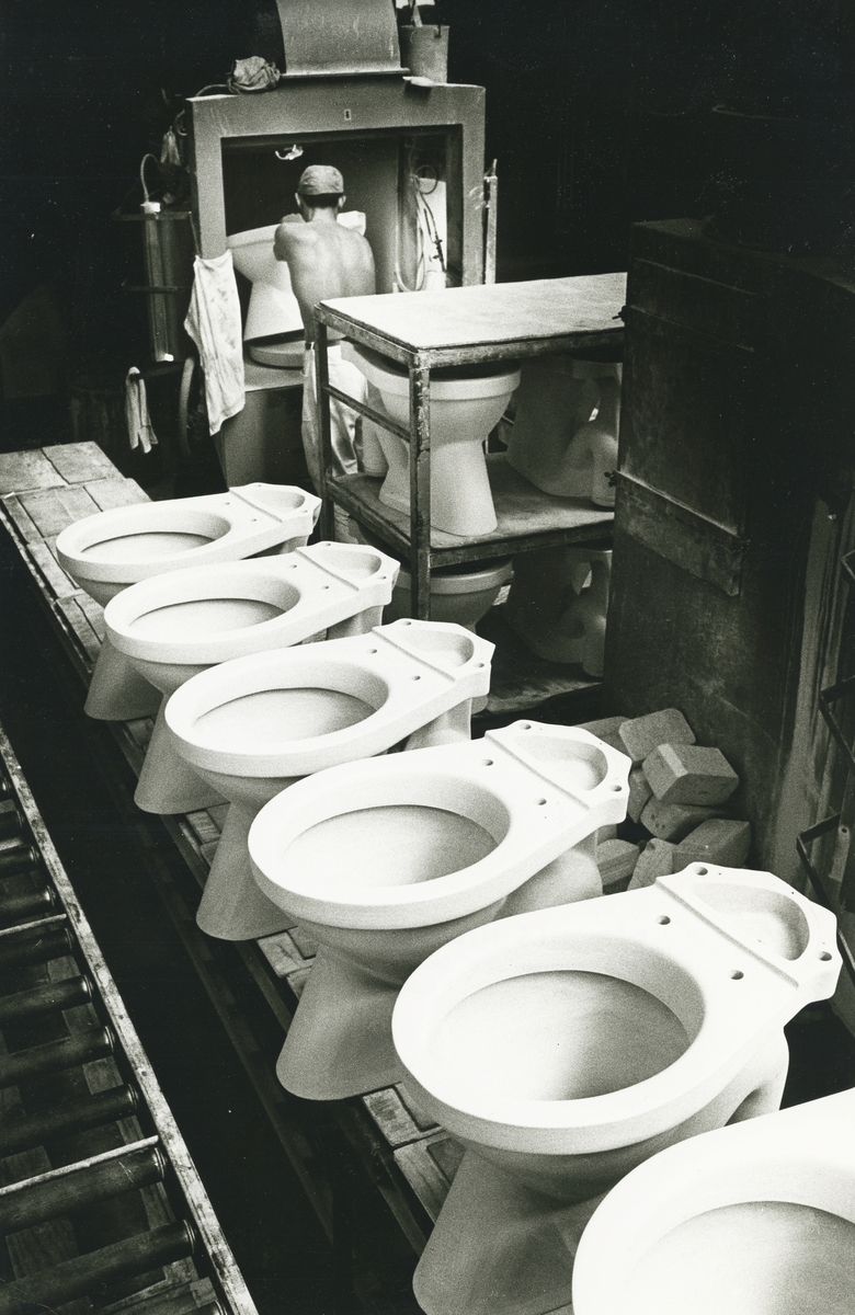 Interiör, Sanitetsporslinsfabriken. Gjutna delar av wc-stolar.