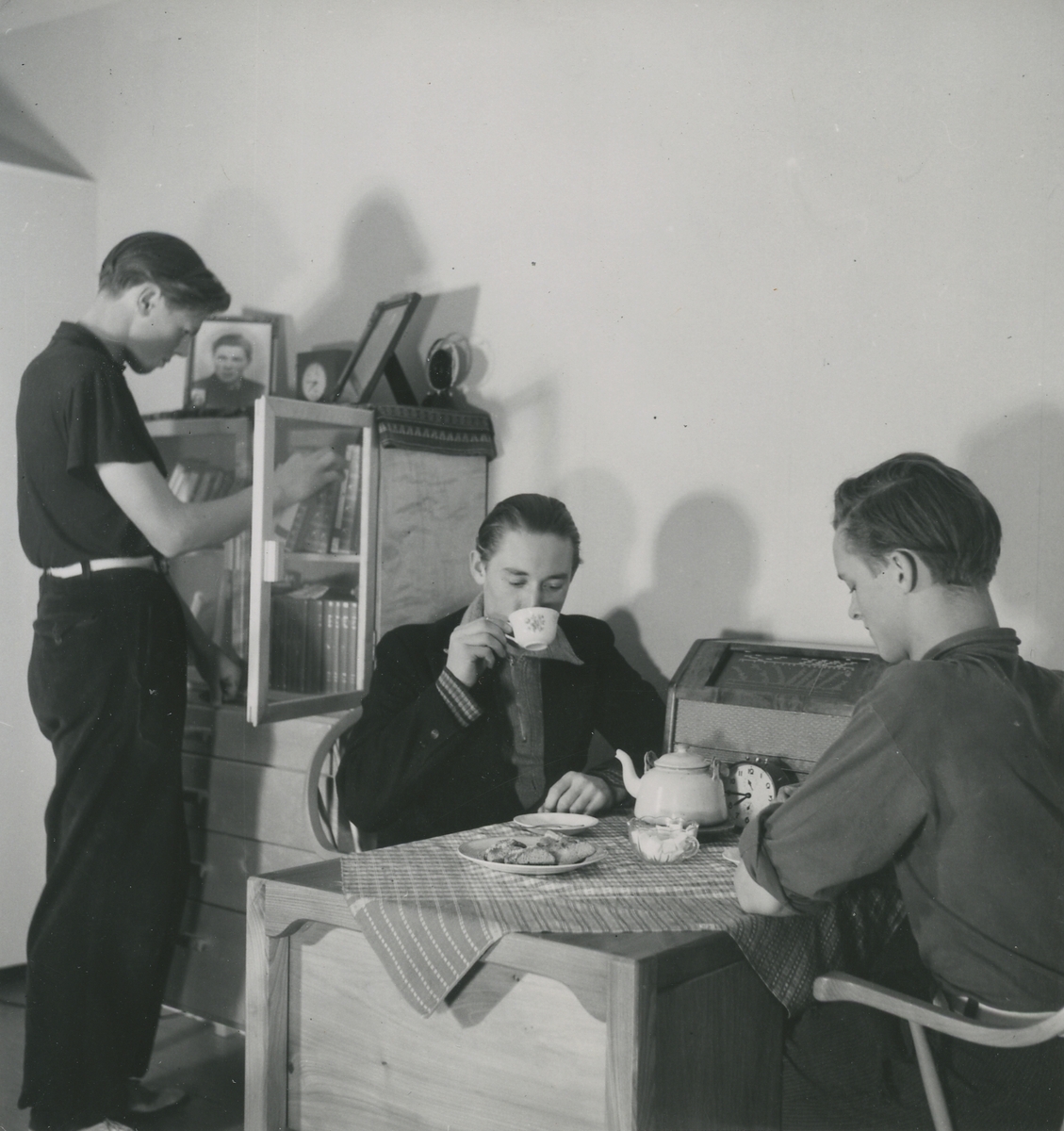 Titel: Interiör, bostadshotellet för unga män, Mariagatan 13. Pågående gemensamma hemaktiviteter. Personer: okända