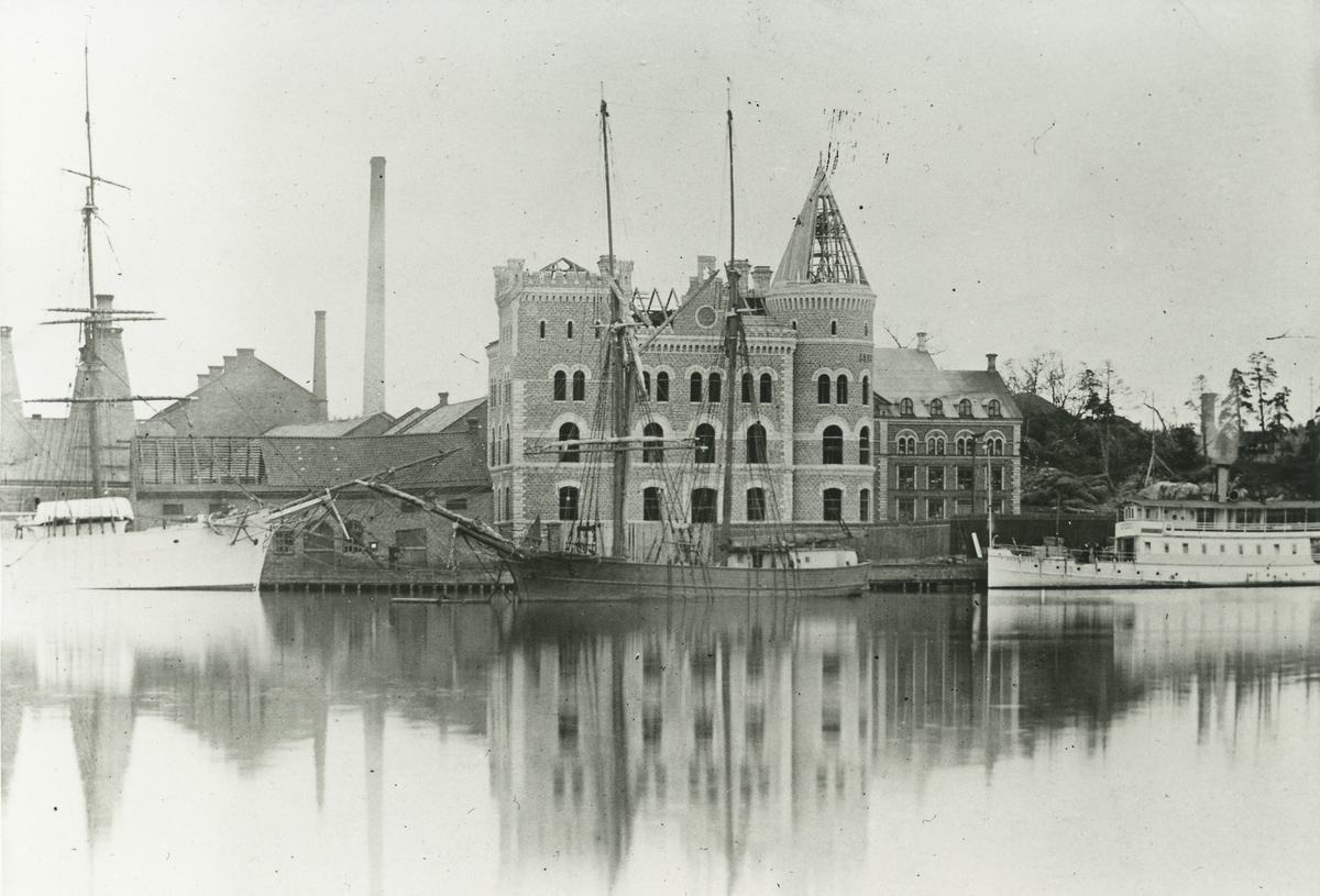 Exteriör. Huvudkontoret under uppförande 1898, Gustavsbergs Hamn och Farstaviken.