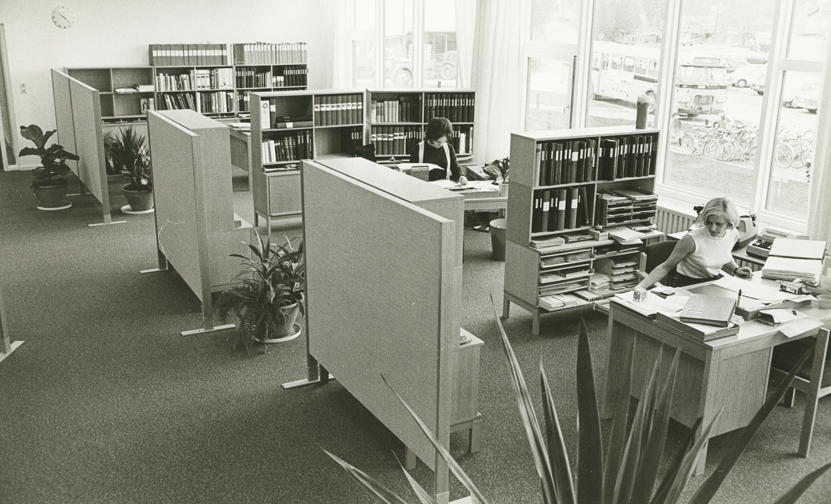 Interiör. Tekniskt center eller i folkmun kallat Glashuset, byggt 1971.<br>Kontoret för Plast/porslin.