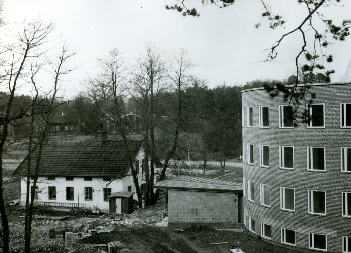 Runda huset under uppbyggnad. Till vänster Tvättstugan som revs strax därefter.