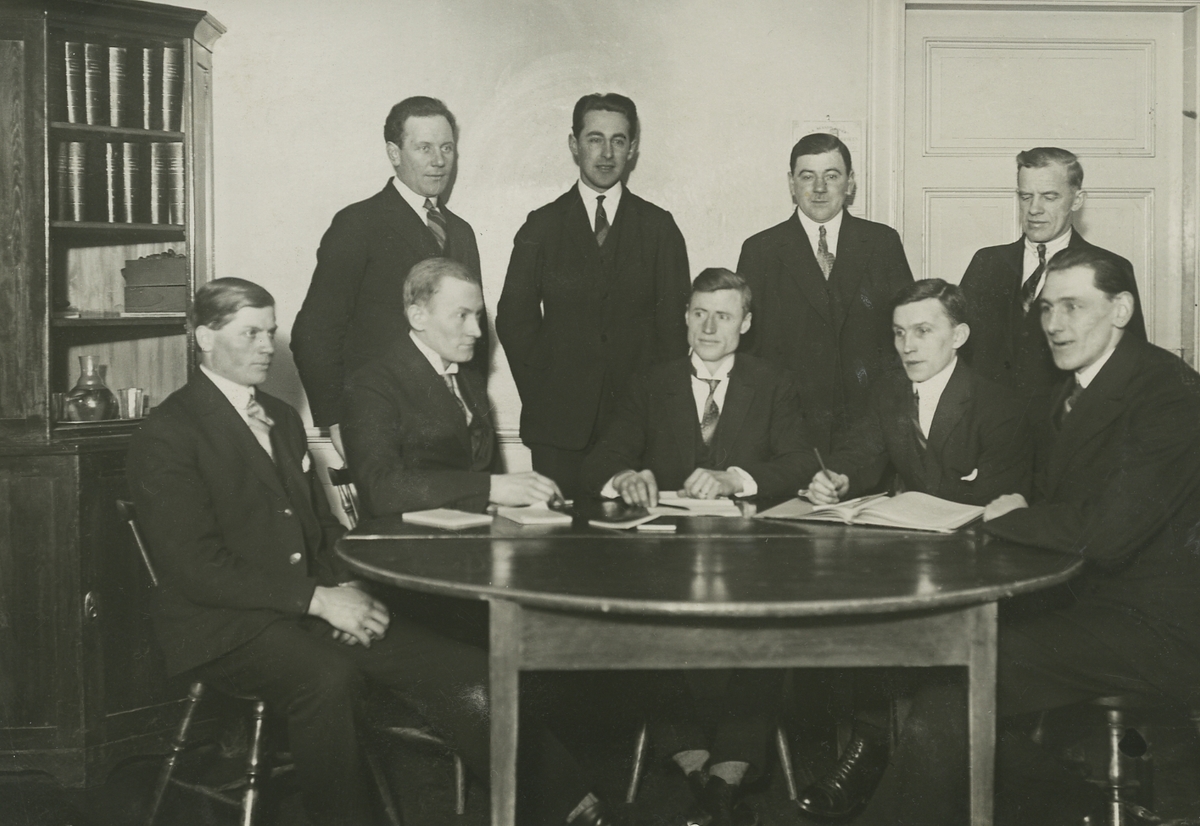 Personer: Stående: Karl Törngren, Harald Persvret, Karl Axell, Herbert Bergschöld<br>Sittande: Henrik Bengtsson, Gustav Gehlin, Georg Box, Karl Berlin, Nils Box
