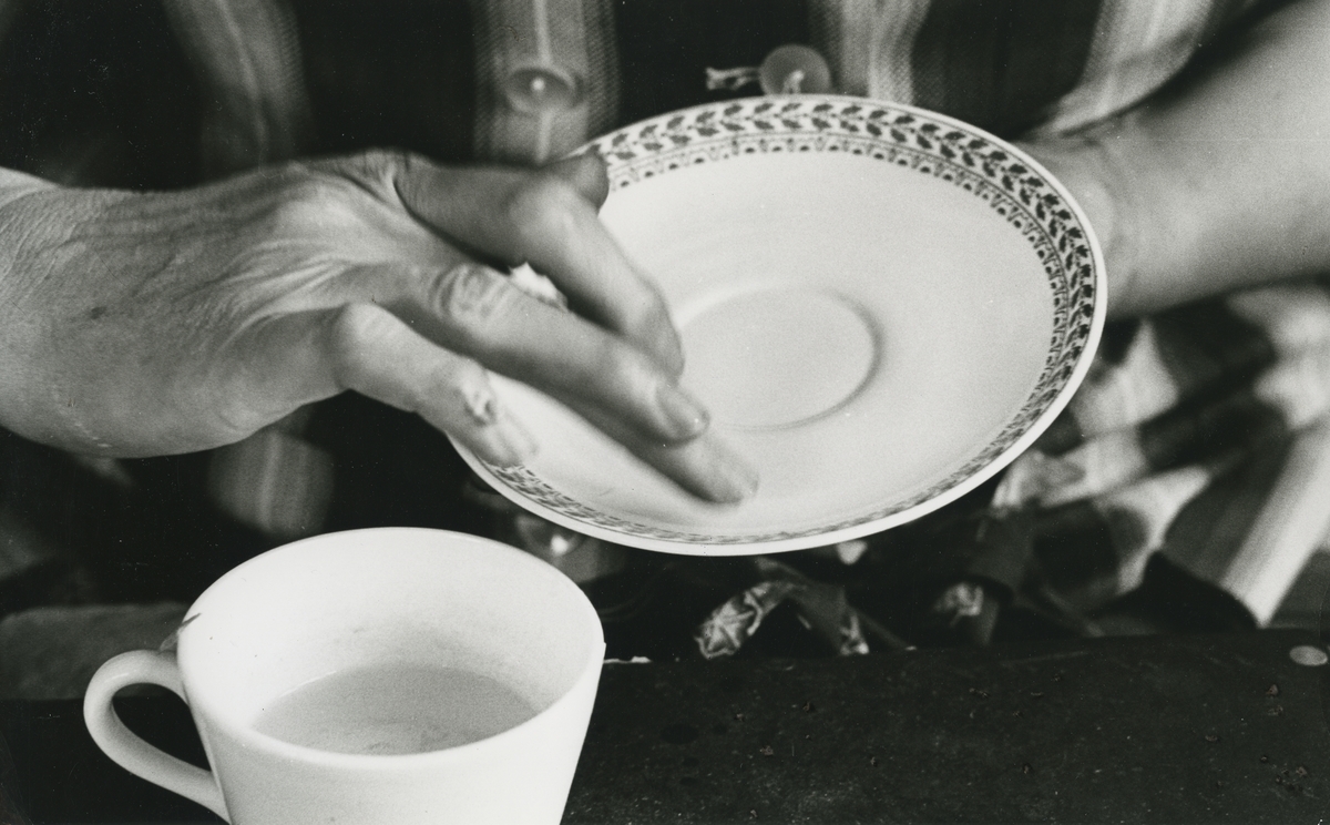Detaljbild. Fastsättning av dekortryck på kaffefat.