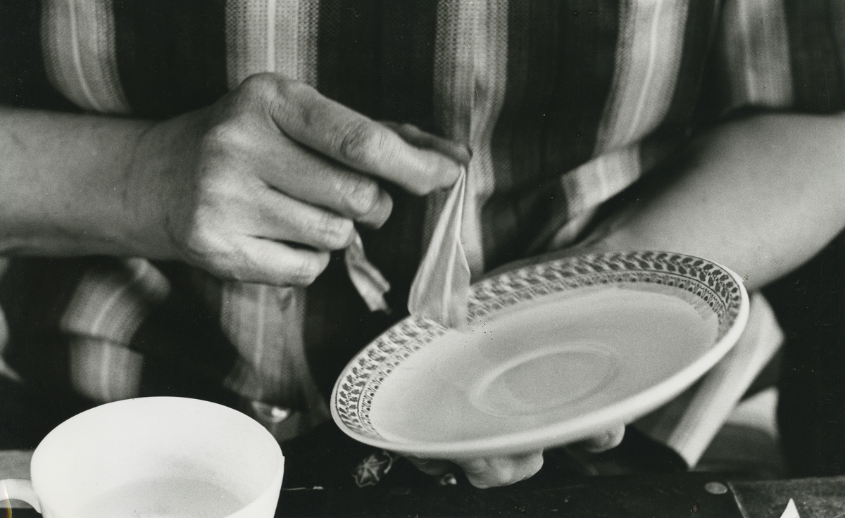 Detaljbild. Fastsättning av dekortryck på kaffefat.