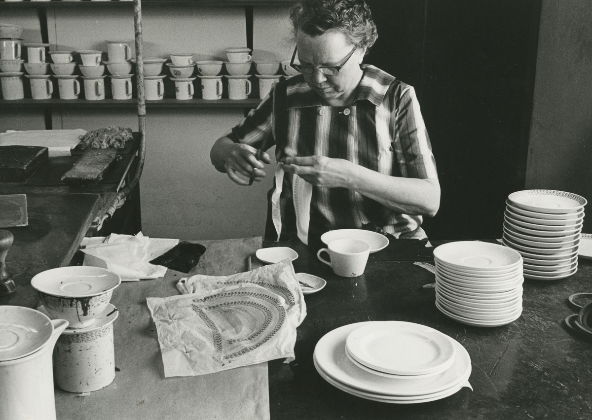 interiör. Hushållsporslinsfabriken. Dekoravdelningen. Fastsättning av dekortryck på tallrikar.