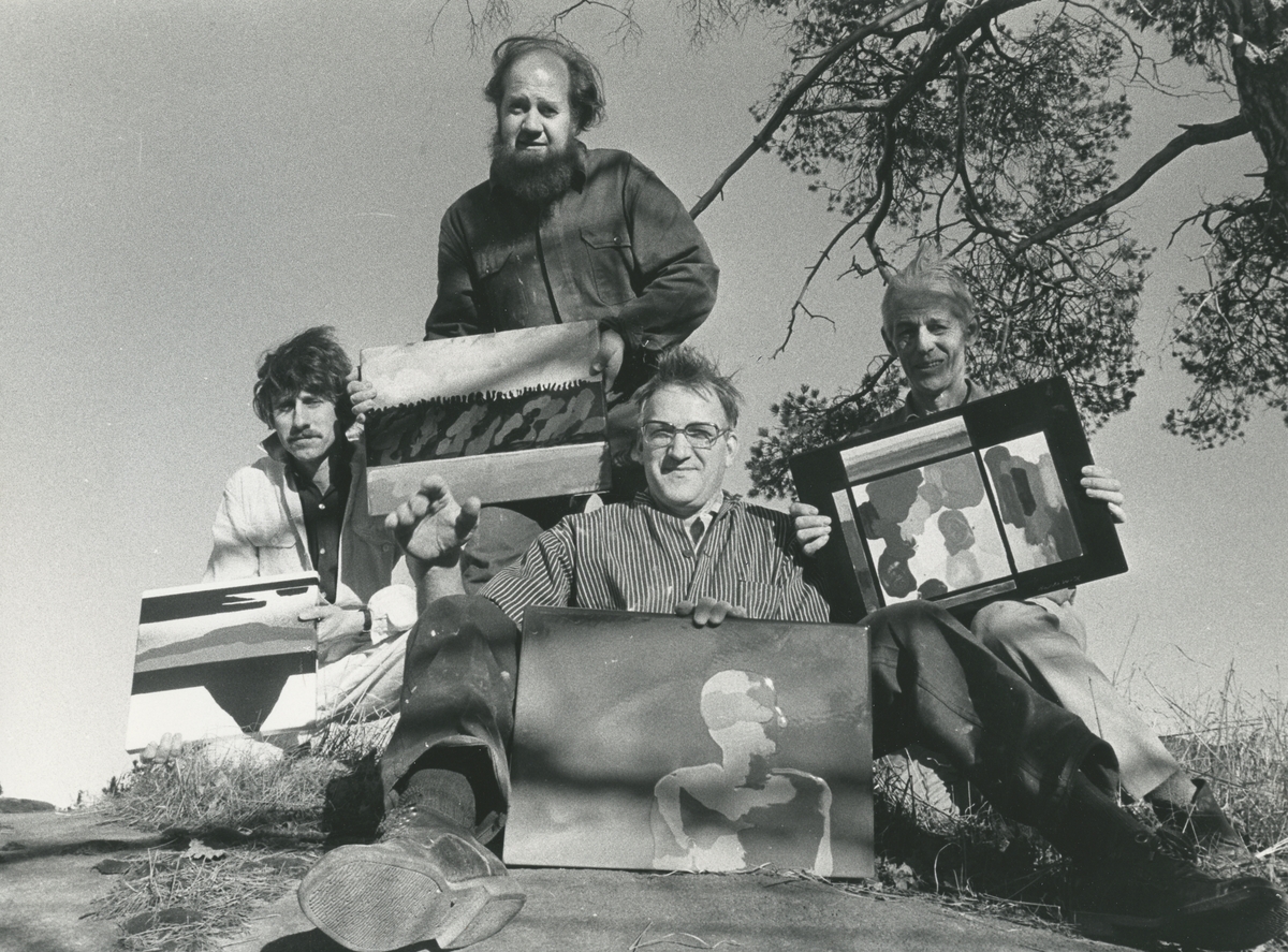 Exteriör. Porträttbild av konstnärerna Bengt Berglund, Göran Nilsson, Alf Olsson och Nalle Werner, uppvisande några av sina emaljverk.
