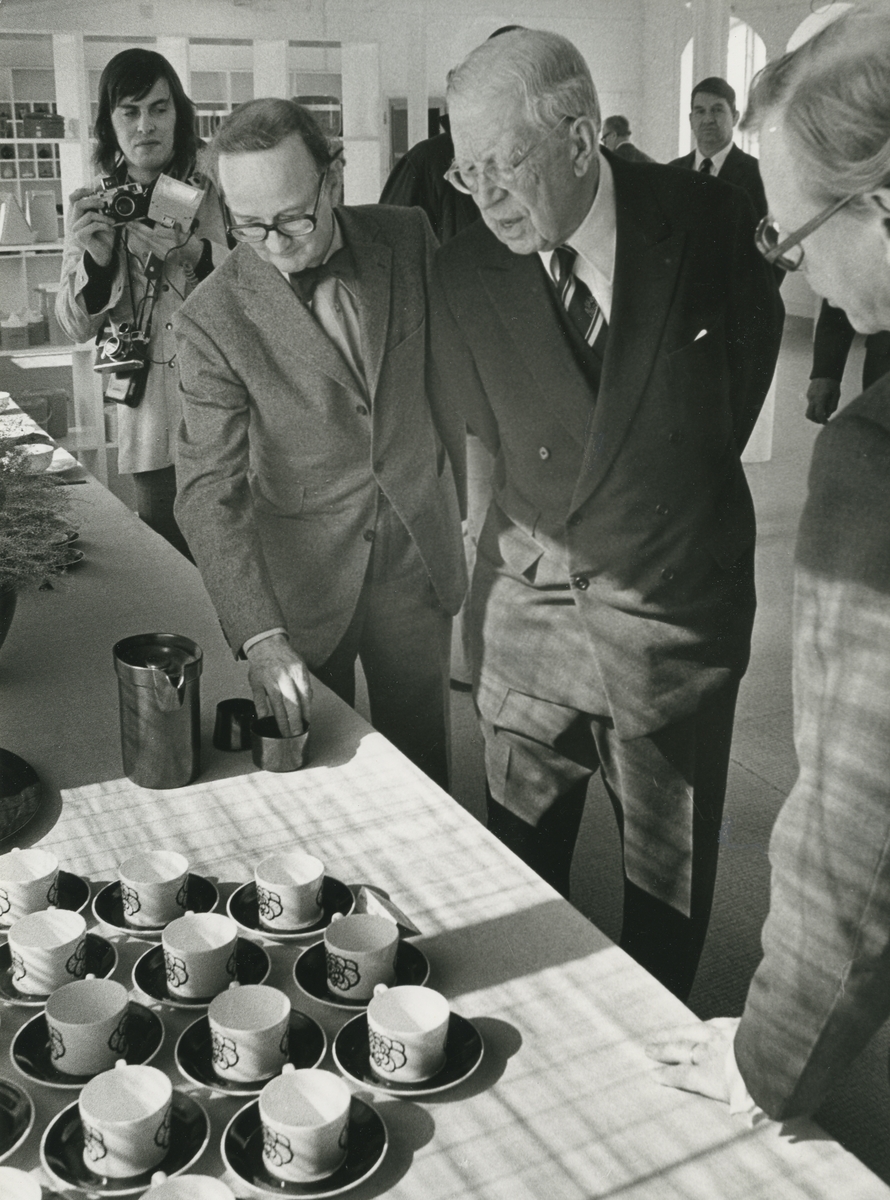 Interiör. Kungligt besök på Gustavsbergs Fabriker. Stig Lindberg, Arthur Hald och Kung Gustav VI Adolf. Förevisning av hushållsporslin, sannolikt på Keramiskt Centrum.