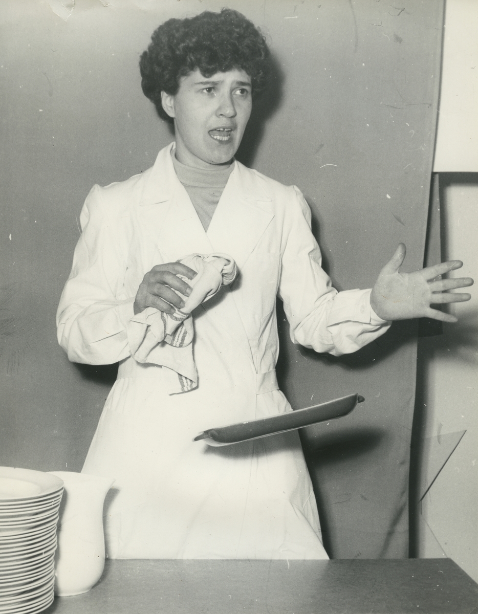 Titel: Interiör, Materiallaboratoriet. Utförande av hållfasthetstest av hushållsgods. Personer: okänd