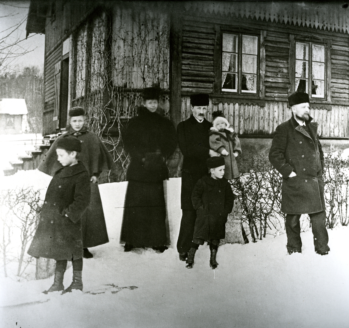 Från vänster står Gerhard Persson med sin syster Valborg, faster Ragnhild med sin man modellör Oscar Ohlsson med dottern Eira på armen. Till höger Gerhards far modellör Alfred Persson.