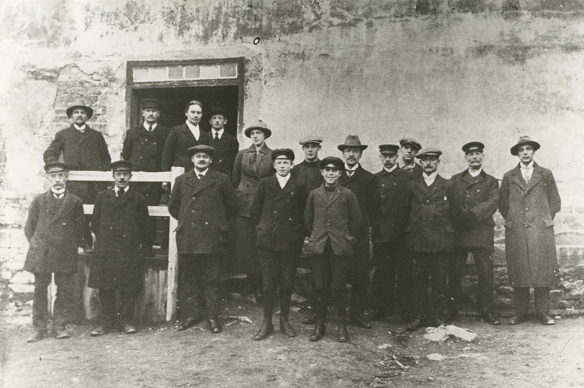 Personer: Övre raden fr v: Alfred Persson, Knut Andersson, Emma Hallberg, Georg Persson, Sigrid Gehlin, Oskar Andersson, Josef Ekberg, Axel Vadström, Harald Brink, Hamlet Lowndes, Fritz Andersson, Gerhard Persson (f 1890)<br>Nedre raden fr v: Viktor Jonsson, Konrad Strömberg, Gottfrid Pettersson, Olle Andersson (son til Knut Andersson), Bertil Severin<br><br>