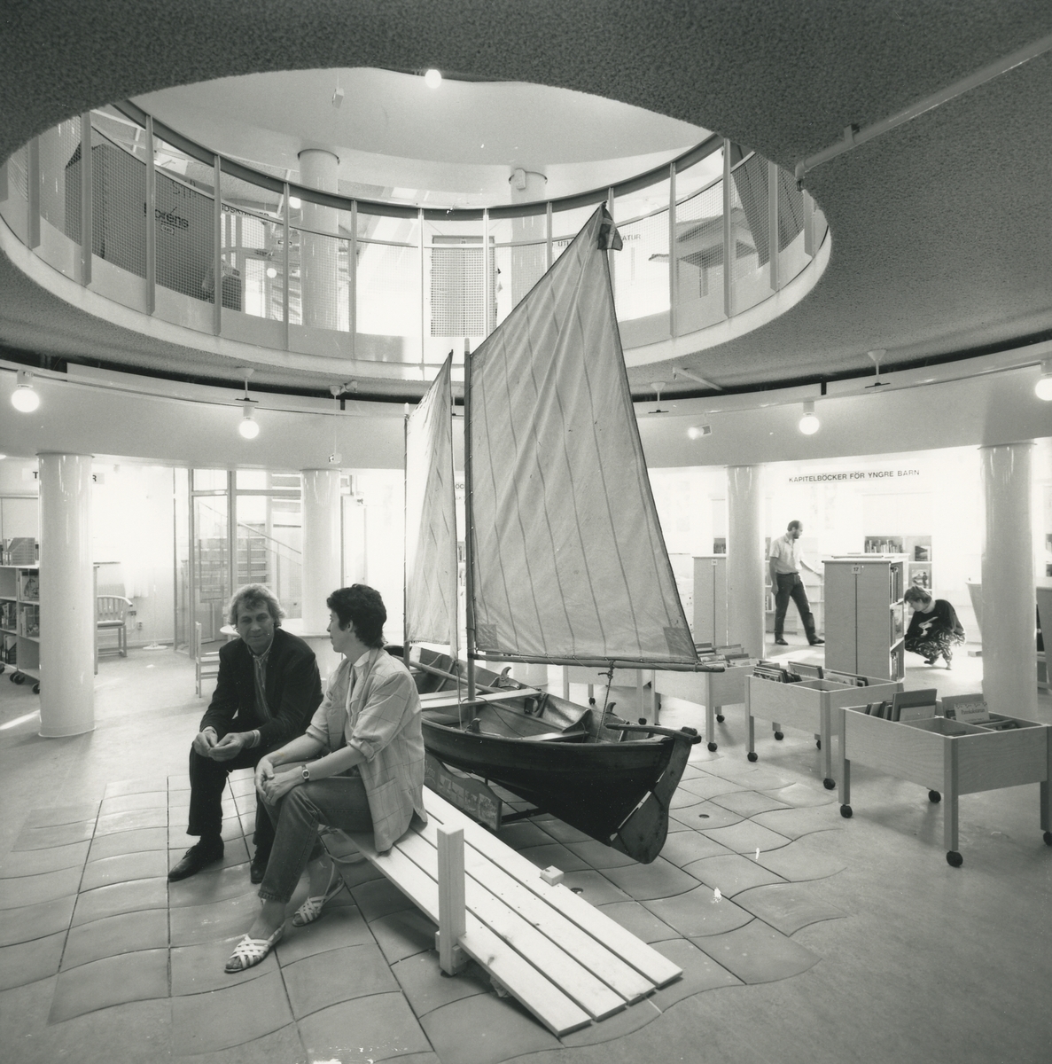Interiörbild. Runda huset inför invigningen som kuturhus och bibliotek. Singösnipan Elvira byggd i mindre format anpassad till bibliotekets barnavdelning. Tina Norderheim -Lindemalm och Åke Axelsson, inredningsarkitekt.